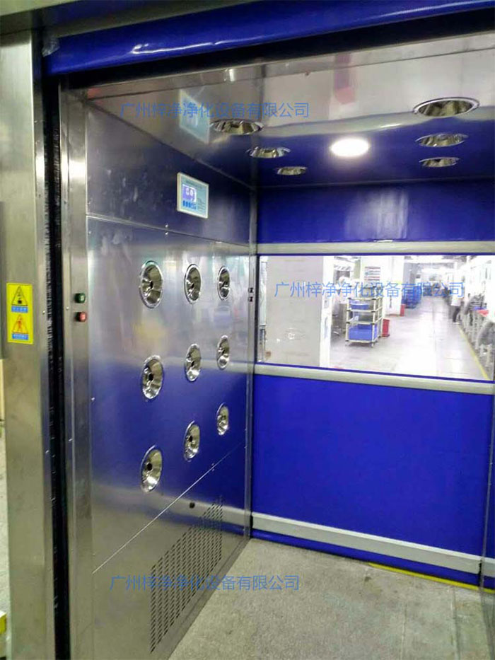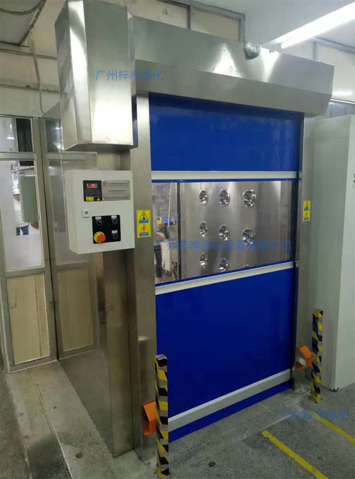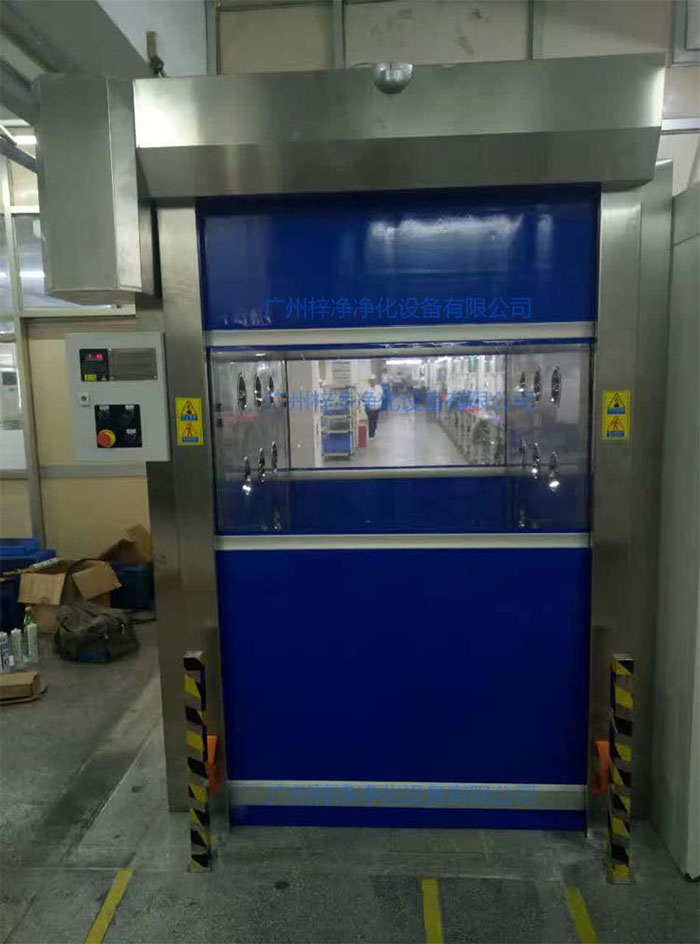 快速卷簾門貨淋室主要是方便推車、輸送帶傳遞物料時實現自動化控制、除塵的空氣凈化設備,快速卷簾門貨淋室前門和后門設置為互鎖狀態。