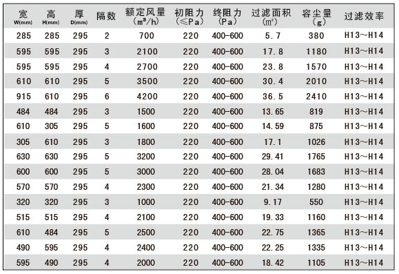 耐高濕有隔板高效過濾器型號(hào)尺寸及其它參數(shù)