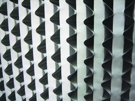2.過濾器濾材兩面180°褶翻,折形成楔形褶層,濾料折彎時(shí)有兩道壓痕,使其在隔板的尾端開成楔形盒式褶層,楔形盒式褶層可以防止濾紙破損。